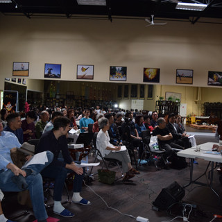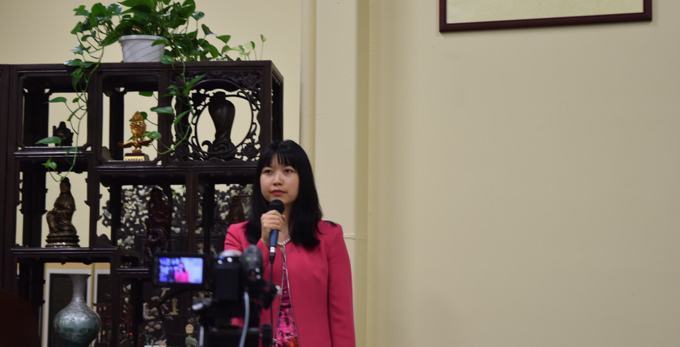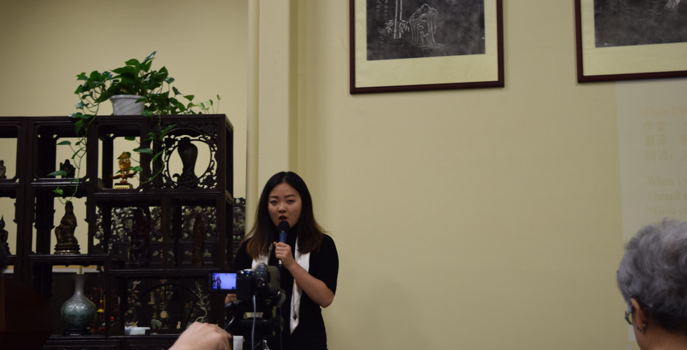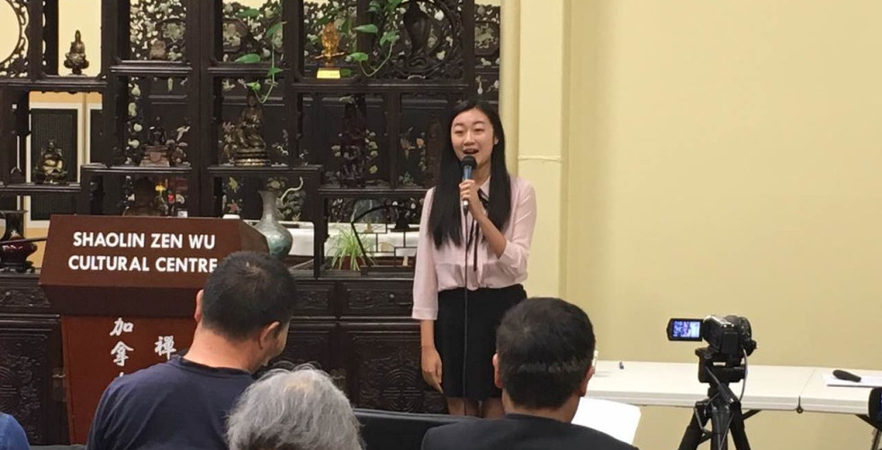 在中英译诗作品朗诵阶段,25位来自大温地区政文商界各路名家和精英,倾情朗诵了21首优美的王健和李盈教授翻译诗篇及原作。其中包括卑斯大学中文班学生,律师George Hungerford朗诵了《月下独白》(李白);卑斯大学中文老师Jenny Lu朗诵了《浣溪沙》(晏殊);加拿大中华诗词学会理事张景晨朗诵了《西江月》(朱敦儒);国会议员助理张维俏朗诵了《老兵》(阿垅); 投资顾问Jackie Liu朗诵了《我二十又一岁时》(When I was One-and-Twenty, by A. E. Houseman);温哥华美术馆发展部艺术工作者周晓鸣朗诵了《天上的织锦》(He Wishes for the Cloths of Heaven, by William Yeats);中国水墨画和书法艺术家,前任温哥华华人艺术家协会会长洪子珺朗诵了《最美的树》(Loveliest of Trees, by A. E. Houseman);漂木艺术家协会副会长章迈和著名作家,全国鲁迅文学奖获得者徐小斌朗诵了《你老了时》(When You Are Old, by William Yeats);卑斯大学中文班学生,电脑工程师Peter Dowdy 朗诵了《咏竹》(郑板桥),加拿大中华诗词学会会长沈家庄朗诵了《秋风词》(李白);卑斯大学中文班学生,银行经理Robert Beamish朗诵了《春望》(杜甫);英文教师Crystal Chen朗诵了《相见欢》(李煜);文思移民与多元文化服务协会会长张馨元朗诵了《所谓永恒》(余光中);叶嘉莹教授高徒,翻译爱好者施淑仪朗诵了《徘徊》(周梦蝶)......近百人参加了讲座,少林禅武文化中心讲厅济济一堂,笑语不断。原计划两个小时的讲座,延长到三个小时。下午近七时,大家才依依不舍散去。